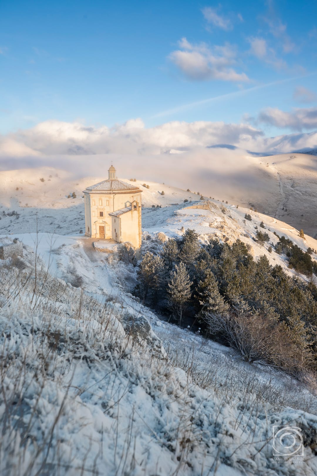 Vedere il castello emergere tra le nuvole con le prime luci dell'alba è una di quelle immagini che rimangono. Rocca Calascio ha qualcosa di magico che è difficile spiegare finché non ci sei dentro: la valle che si apre sotto, la chiesetta di Santa Maria della Pietà con il Gran Sasso alle spalle, una ricchezza paesaggistica che non lascia mai un fotografo a mani vuote.